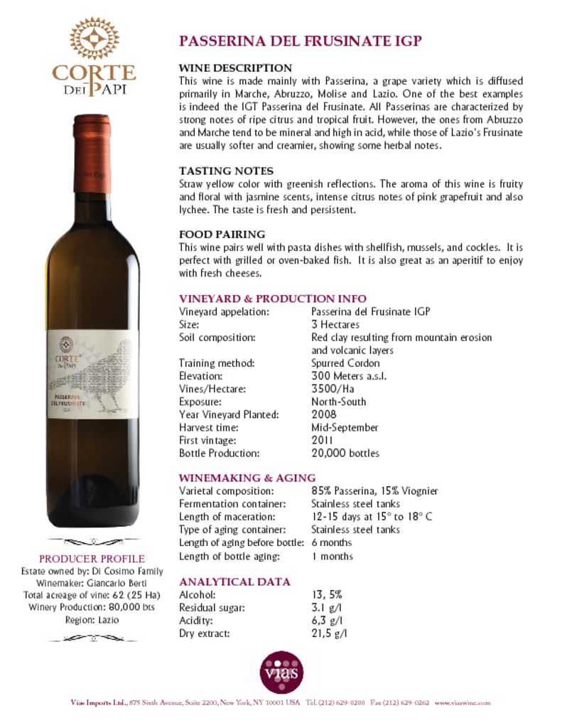 Score: 88Vintage 2021Vinous MediaThe 2021 Passerina del Frusinate is delicate and nuanced, with only green citrus and melon hints forming its bouquet. It’s savory, nearly salty on the palate, with lime-tinged acidity adding further tension. The 2021 finishes with medium length, leaving a twang of sour green citrus.Shelf TalkerFull Page Review
